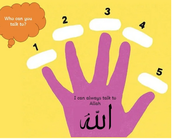 Our children are supported to think carefully about who they can talk to. The network hand helps remind them of five adults they could speak to as well as the opportunity to speak to Allah.